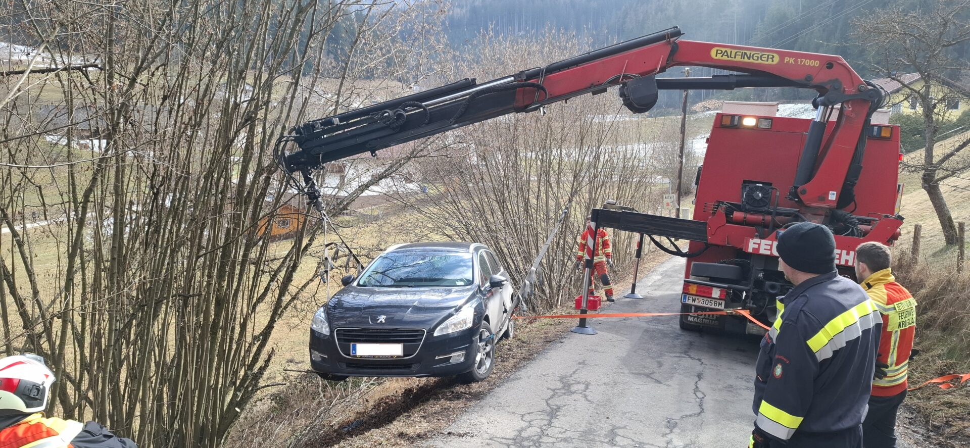 Um eine sichere schonende Bergung durchzuführen wurde das SRF der Feuerwehr Krieglach nachalarmiert. Dadurch konnte das Fahrzeug schließlich rasch und unbeschädigt geborgen werden.